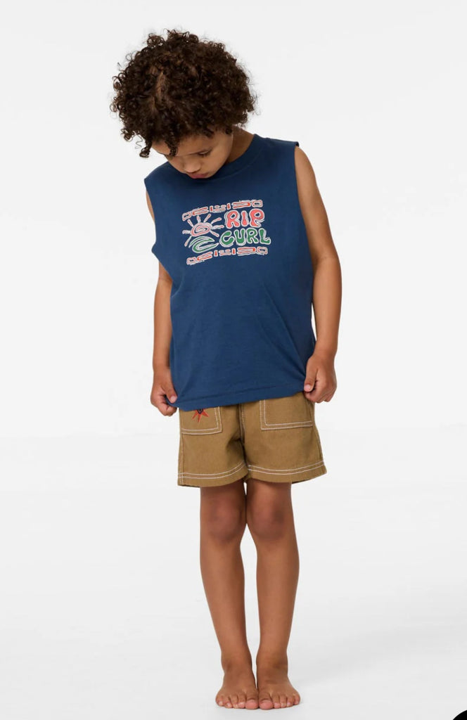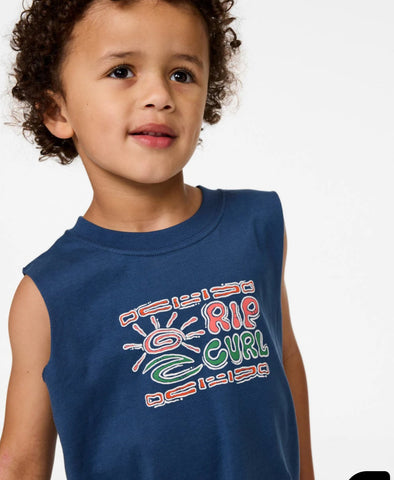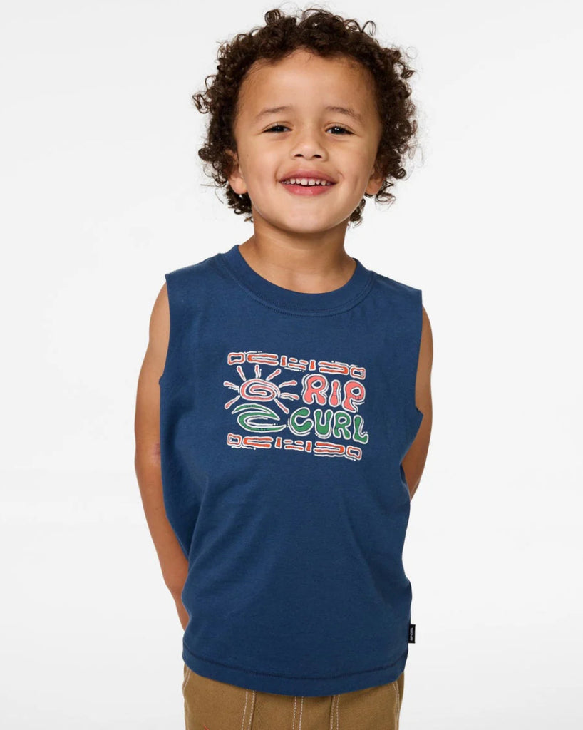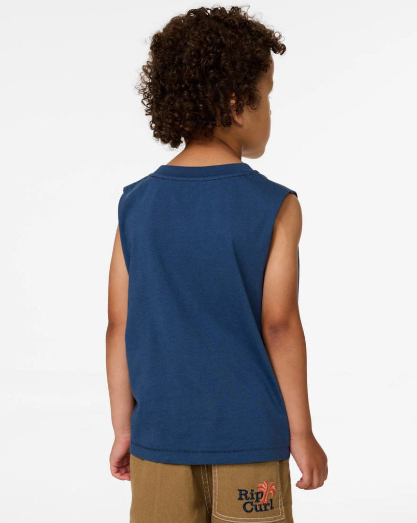 The Cosmic Surfing Muscle Boys (1-8 years) is made from lightweight cotton jersey with a muscle fit silhouette. Featuring a bold front print and woven flag label, this sleeveless tee keeps groms comfortable and cool through long days in the sun or post-surf hangs.
