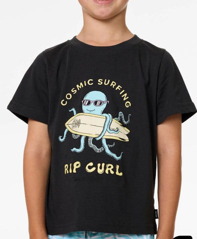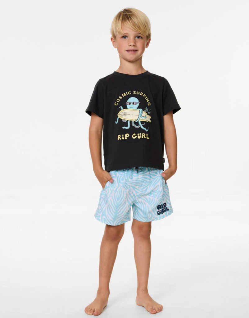 The Cosmic Surfing Tee Boys (1-8 years) is a classic short sleeve built from cotton jersey with a standard fit. Featuring a bold front graphic and woven flag label, it delivers everyday comfort with a surf edge, perfect for warm-weather adventures by the beach.