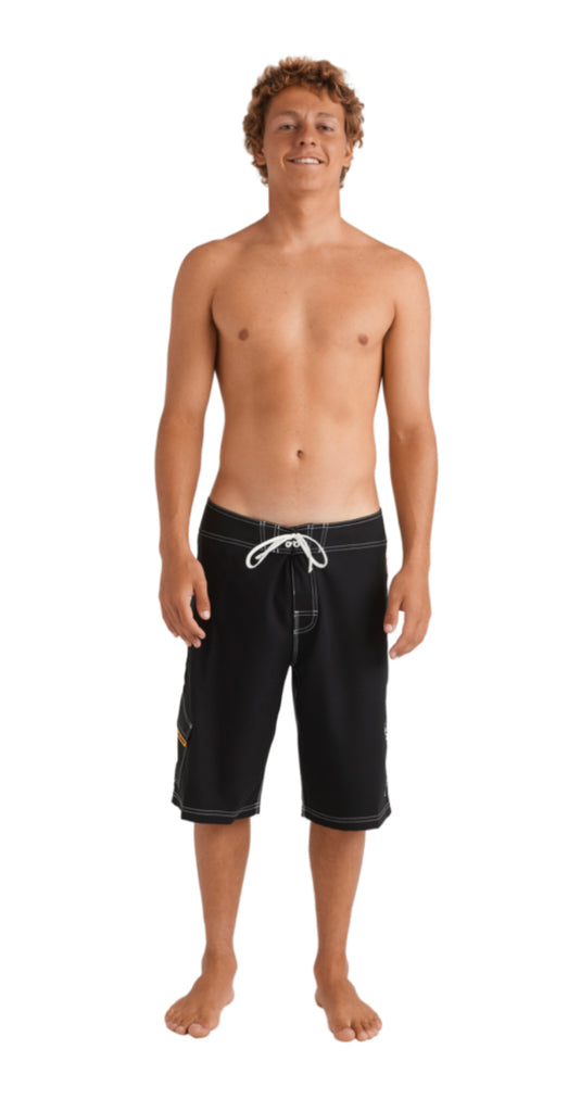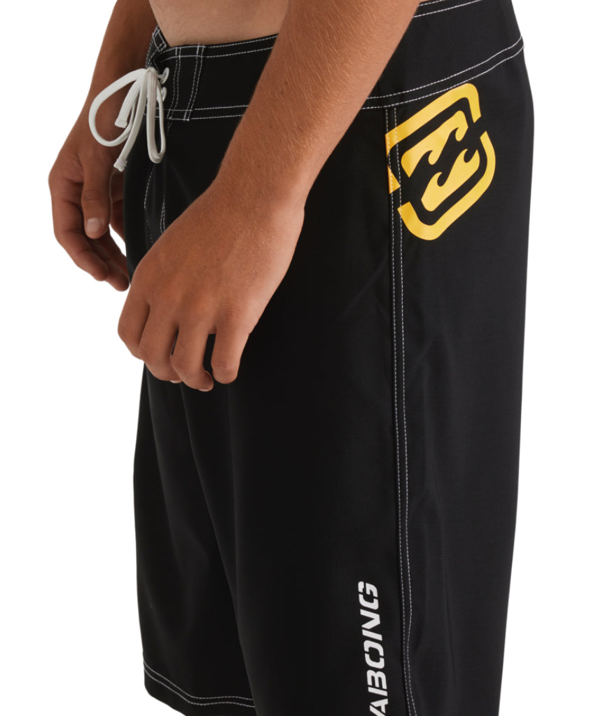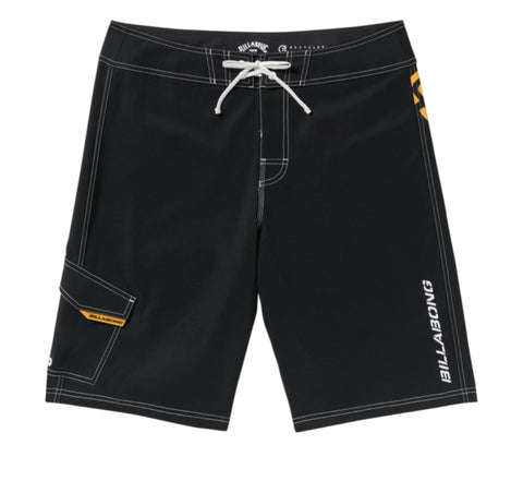 - 21”Length, Fixed Waist Performance Boardshort.Made from recycled PET plastic bottles and finished with a micro repellent coating for a light weight, quick drying fabric.1 x cut ‘n’ sew panel features Billabong stencil font and bracket wave logo.