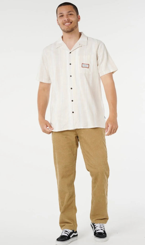Relaxed fit and yarn dyed stripes define the Mod Cali Stripe Short Sleeve Shirt. Made from cotton-viscose slub fabric, it includes a chest pocket and woven badge for laid-back beach vibes.